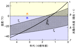 太陽光度の時間的変遷。 Teは放射平衡温度 (温室効果なし),Tsは気候モデルによる温度 (温室効果あり)。