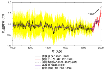 最も重要なデータとして,マンら (Mann et al.; 1998;1999) による,過去1000年間の世界各地の地表気温変動指標がある。そこには,明かに温度異常(temperature anomaly)がある (図)。