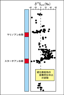 さて、氷河堆積物の直上で硫化物鉱物の硫黄同位体比が大きな正の値をとっているということはどういうことか。すでに述べたように、硫酸還元バクテリアによる硫酸イオンの還元が進行すると、海水中の硫酸イオンの硫黄同位体比は正の値になる。海水中の硫酸イオンが乏しくなった状況下で硫酸イオンがさらに還元され、それが二価の鉄イオンと結びついて硫化鉄ができると、その硫黄同位体比は正の同位体比をもつことが期待される。すなわち、硫黄同位体比は氷河時代に海水中の硫酸イオンが乏しくなっていたことになり、こうした状況は全球凍結した地球のイメージと符合しているというわけである。