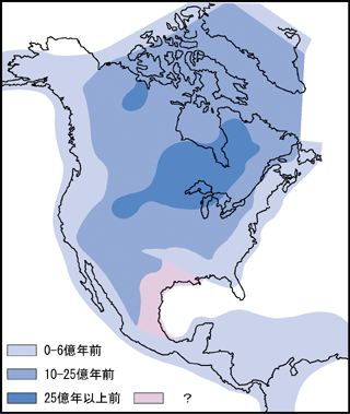 1960年代にRb-Sr法による岩石の絶対年代測定が盛んに行われるようになった。大陸地殻の形成年代分布が明らかにされると、それに基づいて新しい形成発達モデルが提唱された。とりわけ、北米大陸については、年代値が大陸の中心から縁辺部へと時代とともに大陸が成長していくようすが描き出され、多くの教科書で取り上げられた(図1)。