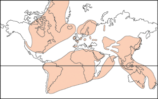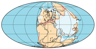 この図には、北米、グリーンランドにまたがる大陸、南米、アフリカ、インドにまたがる大陸、東南アジアからオーストラリアにかけての大陸が描かれている。エドワード・ジュースは、古生代にインド、アフリカ、マダガスカル、南米がかつてひとつの大陸だったとして、これをゴンドワナランドと名づけた。