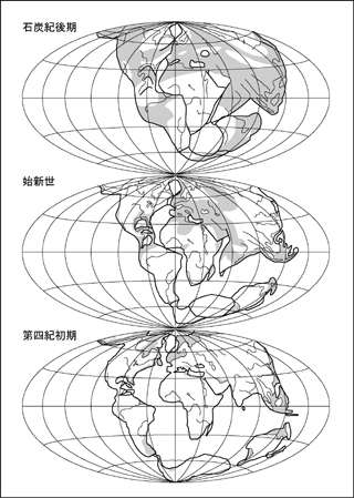 これに対し、ドイツのアルフレッド・ウェーゲナーは、南米とアフリカの海岸線の形の類似性に気づき、これらの2つの大陸がかつては合体していたものが、大西洋が開いて分裂したとする大陸移動説を提案した。ウェーゲナーは、化石の産出記録、氷河堆積物の分布など、地質学的証拠をもとに、古生代に巨大な大陸が存在していたとし、ゴンドワナランドに南極やオーストラリアも加えて、この大陸をパンゲアと名づけた。図3は、ウェーゲナーが描いた古生代、新生代第三紀、第四紀の大陸配置である。