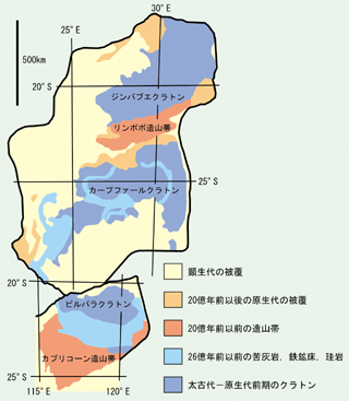 ところで、太古代のクラトンとして、カープファールの北にジンバブエクラトン、ピルバラの南にはイルガーンクラトンがある。ジンバブエとカープファールの境界部の造山帯がリンポポ造山帯、ピルバラとイルガーンの境界にできた造山帯がカプリコーン造山帯である。これらの造山帯は、20-18億年前のものである。このころ各地にできた古い大陸が集合して、さらに大きな大陸へと発展していったことを先カンブリア時代の造山帯が物語っている。