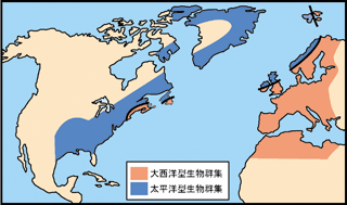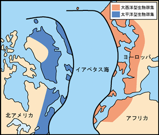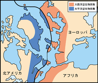 図1は、古生代の生物地理区を示したものである。この図には、「太平洋型生物群集」と「大西洋型生物群集」が示されている。太平洋型生物群集は、北米大陸に広く分布しているが、海を隔ててグリーンランドやイギリス、スカンジナビア半島西部にまで分布していることが読みとれる。また、大西洋型生物群集は、ヨーロッパや北アフリカに分布しているが、大西洋を隔てて北米のニューファウンドランドにも分布が確認されている。