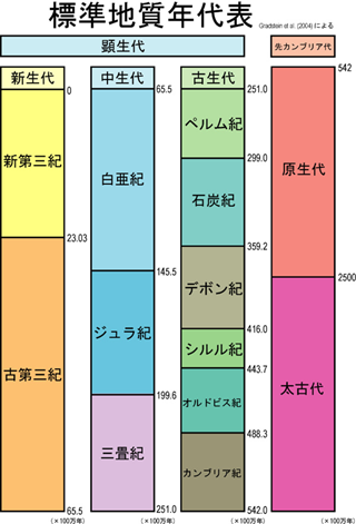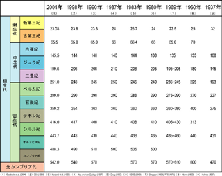 すなわち、生物の進化を時間発展の指標として相対的な時代区分がまず行われた。やがて、ウラン、カリウム、ルビディウムなどの放射性元素を用いて、地質時代に数的時間目盛りが与えられ、地球の歴史は45億年、先カンブリア時代と古生代の境界が5億7000万年前というように年代値が与えられていった。こうした研究を総合して地質時代の時間スケールをとりまとめた本として、1989年にケンブリッジ大学出版会から発行されたB. ハーランドのThe Geologic Time Scaleが広く参照されてきた。その改訂版が2004年に新しい執筆者たちによって編集された(図1)[1]。