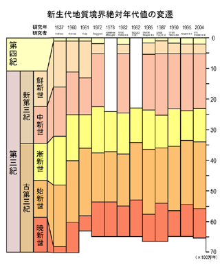 この間、地質時代境界の認定、ストロンチウム同位体比や炭素同位体比を用いた地層の対比手法の導入、ミランコビッチサイクルのような宇宙のリズムを時間目盛りに使う手法、ジルコン粒子を用いた精密な放射性同位体を用いた年代測定データが多数発表されるなど、大きな研究の進展があった。ここでは、最新の地球史年表を示すと同時に、それぞれの地質時代の境界の年代が研究の進展とともにどのように移り変わってきたのかをグラフにしてみた(図2,3)。